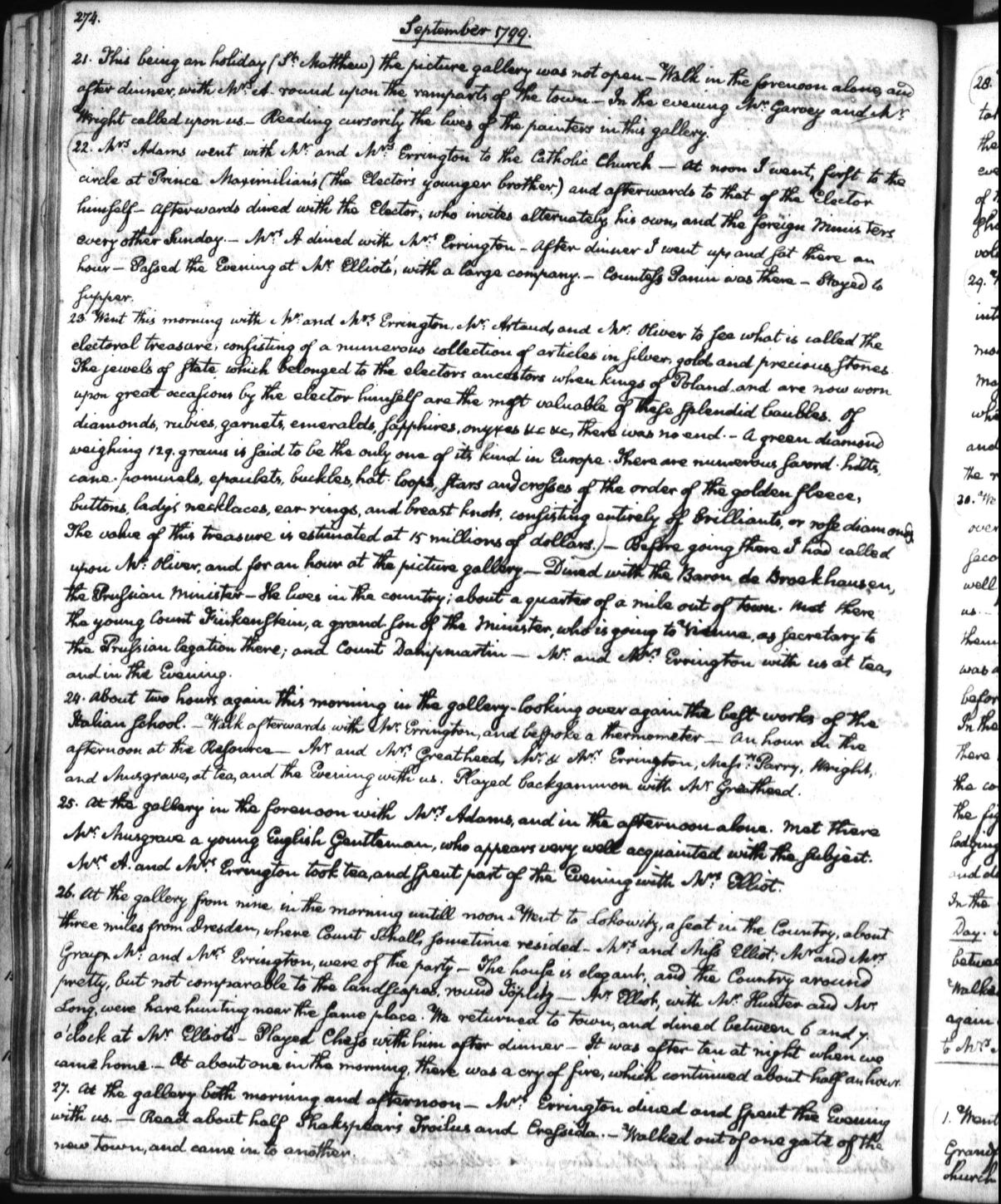 JQA and Louisa Catherine spent four years in Berlin, from 1797 to 1801. Every summer, they left the city for a couple of months and traveled around the countryside, visiting small towns, hiking, and touring ruins and museums. In September 1799, they were in the territory of Saxony. A few days after their official introduction to the Elector Frederick Augustus I and Electress Amalie of Zweibrucken-Birkenfeld, they went to view the “electoral treasure, consisting of a numerous collection of articles in silver, gold, and precious stones. The jewels of state which belonged to the electors ancestors when kings of Poland, and are now worn upon great occasions by the elector himself are the most valuable of these splendid baubles,” John Quincy wrote. There was no end to the “diamonds, rubies, garnets, emeralds, sapphires, onyxes,” but the most impressive piece was “A green diamond weighing 129. grams.” The green diamond “is said to be the only one of its kind in Europe,” he noted.