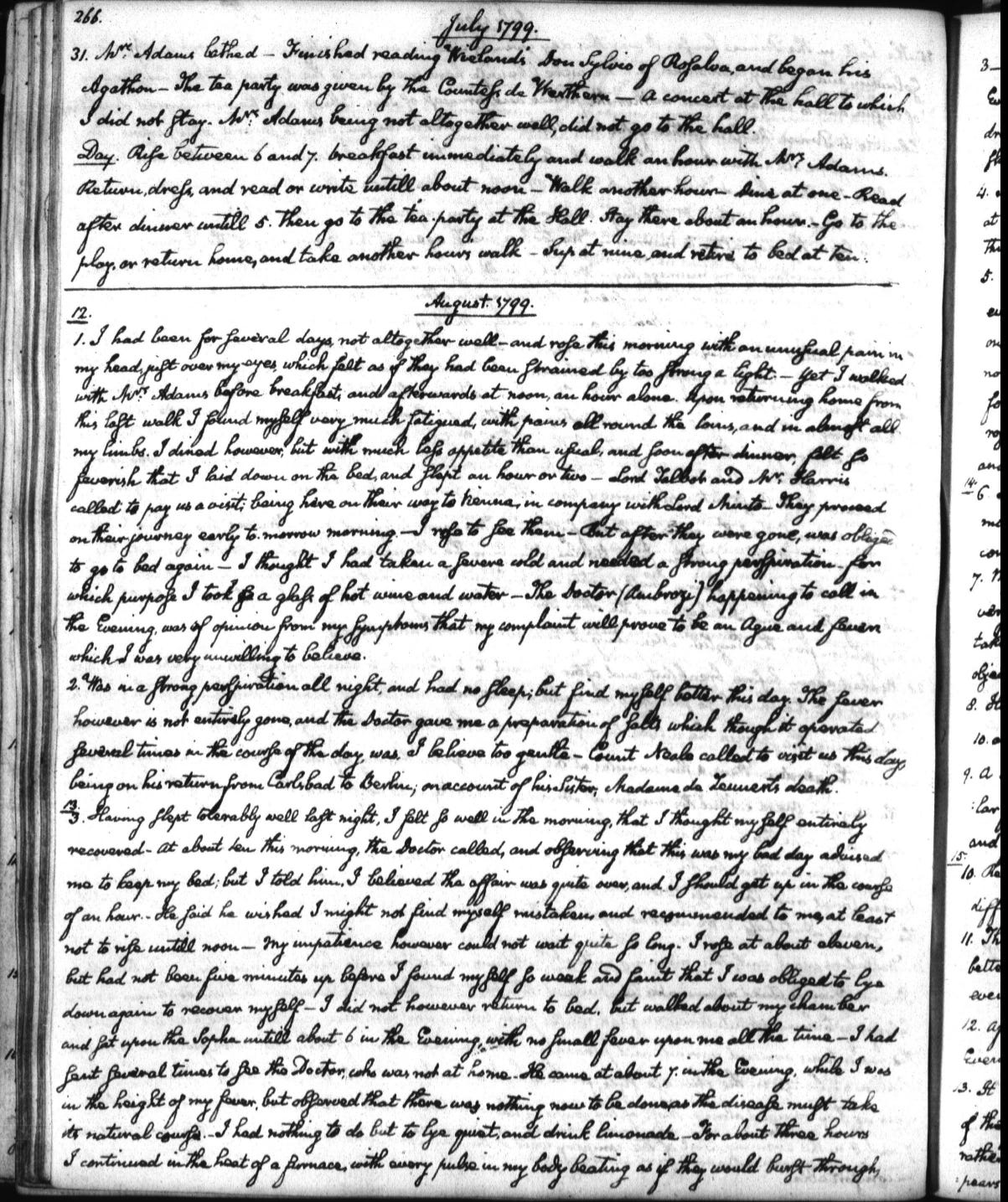 John Quincy Adams had been sick for a couple of days and was determined that he was recovered by August 3. “At about ten this morning, the Doctor called, and observing that this was my bad day advised me to keep my bed; but I told him, I believed the affair was quite over, and I should get up in the course of an hour.— He said he wished I might not find myself mistaken, and recommended to me, at least not to rise untill noon— My impatience however could not wait quite so long— I rose at about eleven, but had not been five minutes up before I found myself so weak and faint that I was obliged to lye down again to recover myself.”