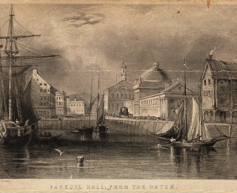 Below is an engraving of Faneuil Hall in 1775. By 1800, Boston would have been built up a bit.